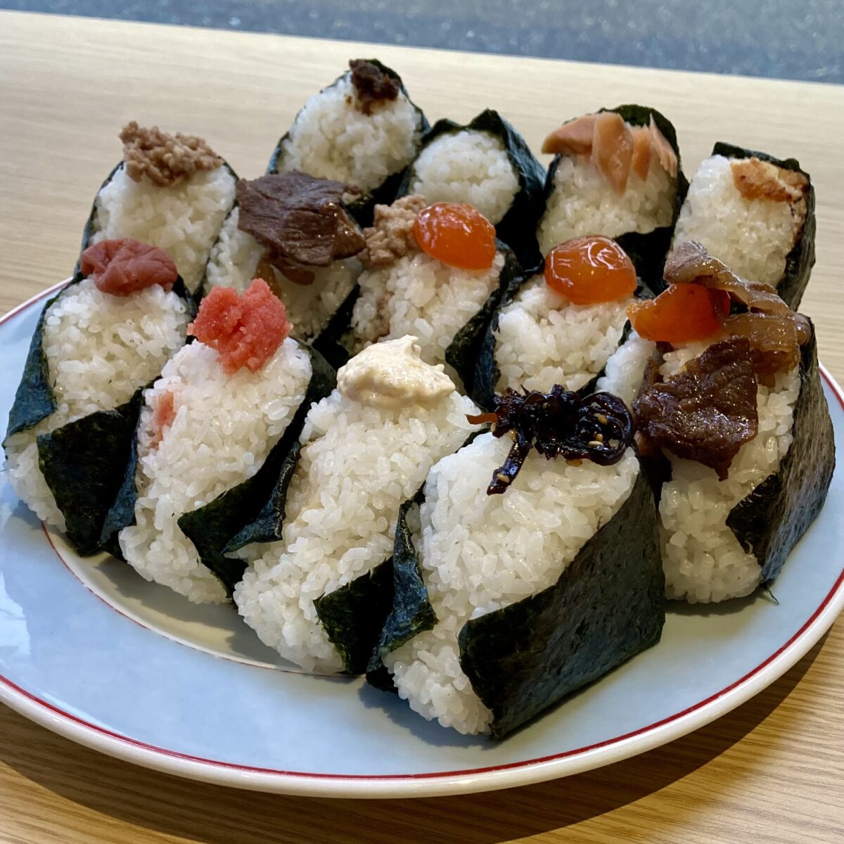 麻雀の役満「国士無双」をモチーフに、13種類すべて異なる具材のおにぎりを13個盛り込んだガチ盛りメニューです。上越産コシヒカリを使用し、すき焼きやくびき牛、肉みそ、塩引鮭、たらこ、昆布、梅干しなど、一皿で13通りの味を食べ比べできます。おにぎりは小ぶりサイズで、2〜4名でのシェアを推奨しています。