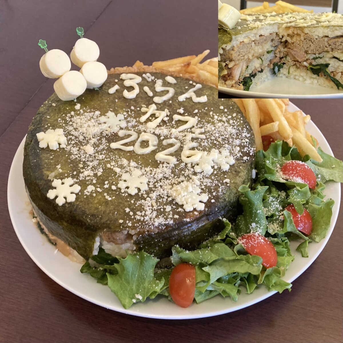 好評の巨大肉肉おにぎりの2026年Ver.! 総重量2kg超!! 今年もふんだんに肉肉肉。グレードアップしたぶらんカフェのガチ盛りを是非ご賞味下さい。