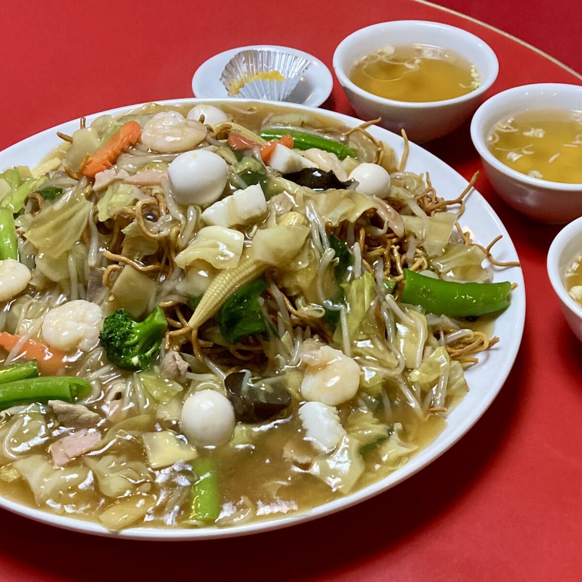 約3.5人前の揚げ麺に、海鮮や豚肉、季節の野菜がたっぷり入った五目あんをかけた、大満足の一品です。