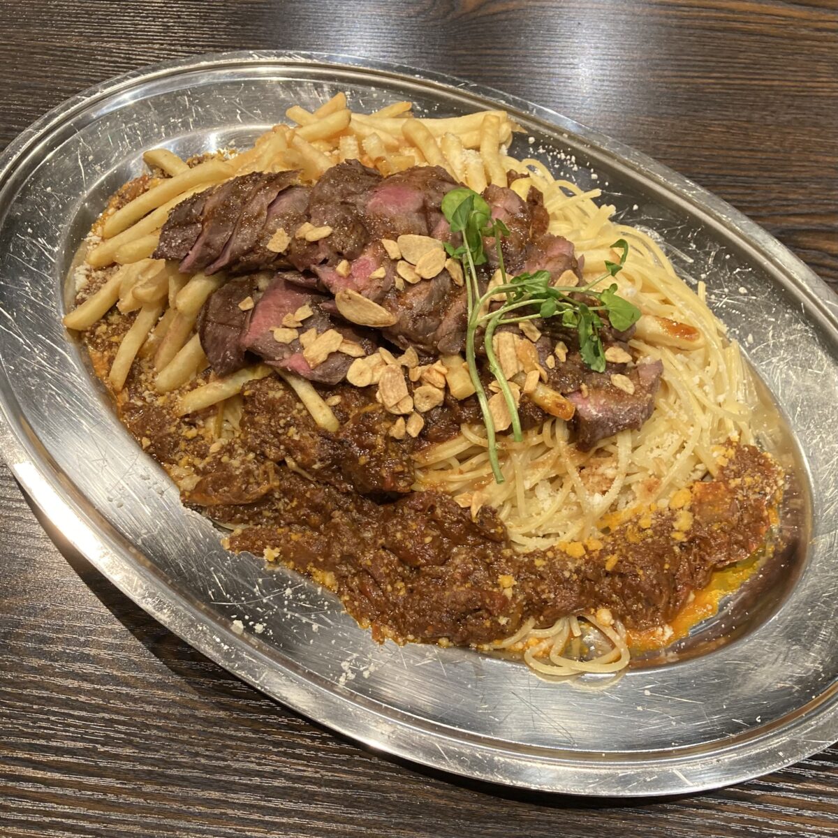 人気の赤身ステーキ200gと牛すじのラグーソースパスタ3人前とポテトの特別メニューです。