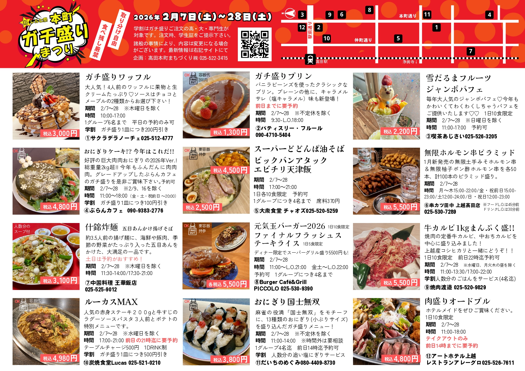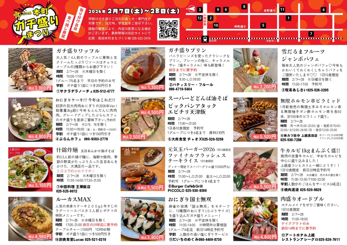 取り分け自由。食べ残し厳禁。山のような特別メニューが、高田エリアの参加店各店で提供されます。雪深い2月、高田で楽しいひと時をお過ごし下さい。